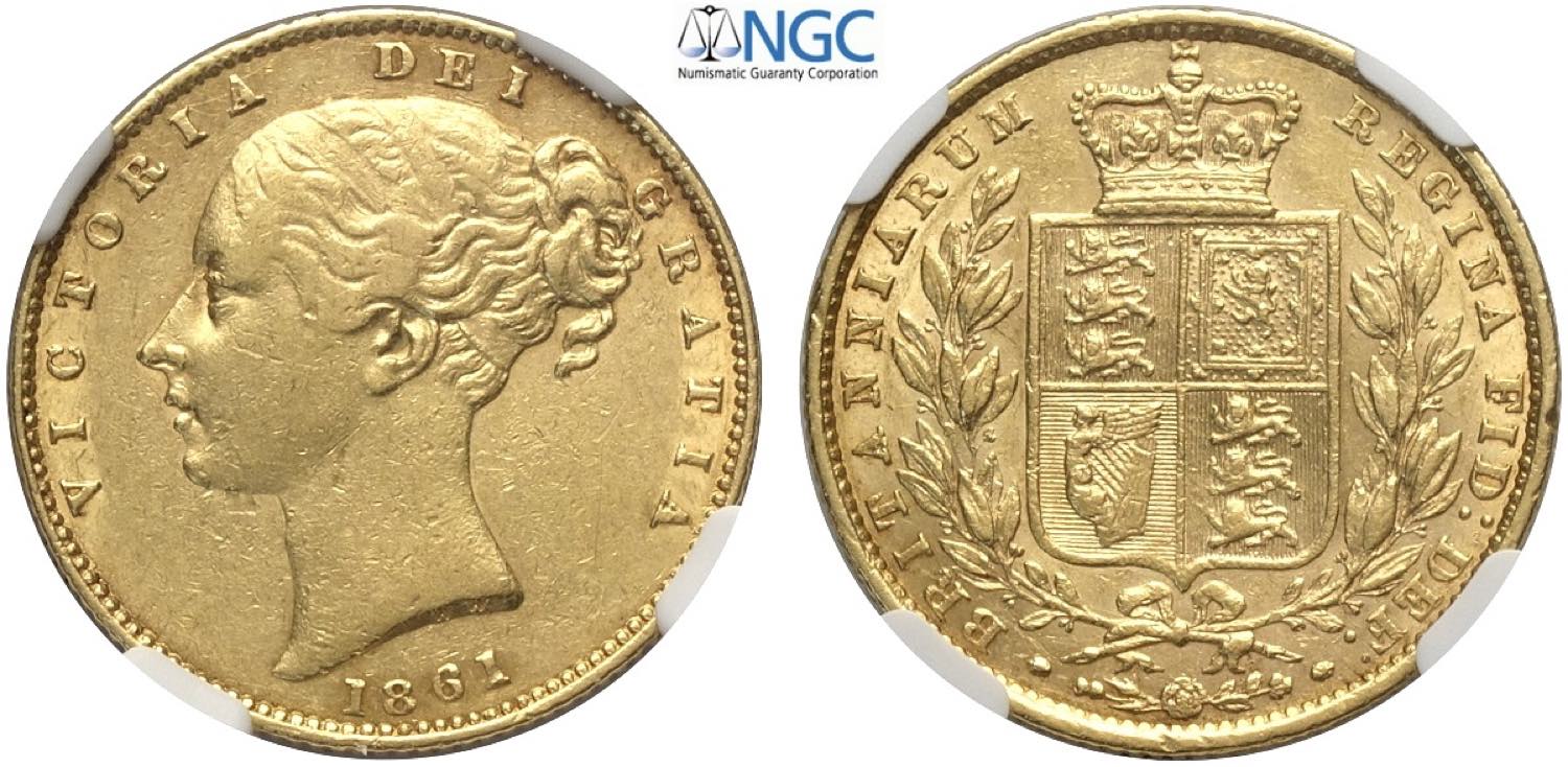 Great Britain, Victoria (1837-1901), Shiled Sovereign 1861, Au mm 22 in Slab NGC AU53 (cert. 5788355016)