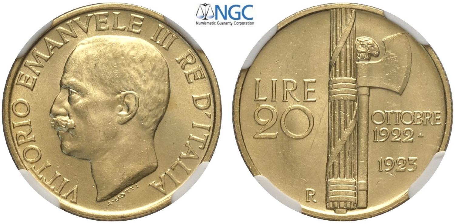 Regno d'Italia, Vittorio Emanuele III (1900-1943), 20 Lire 1923, Rara Au mm 21 In Slab NGC MS62 (cert. 4478378010)