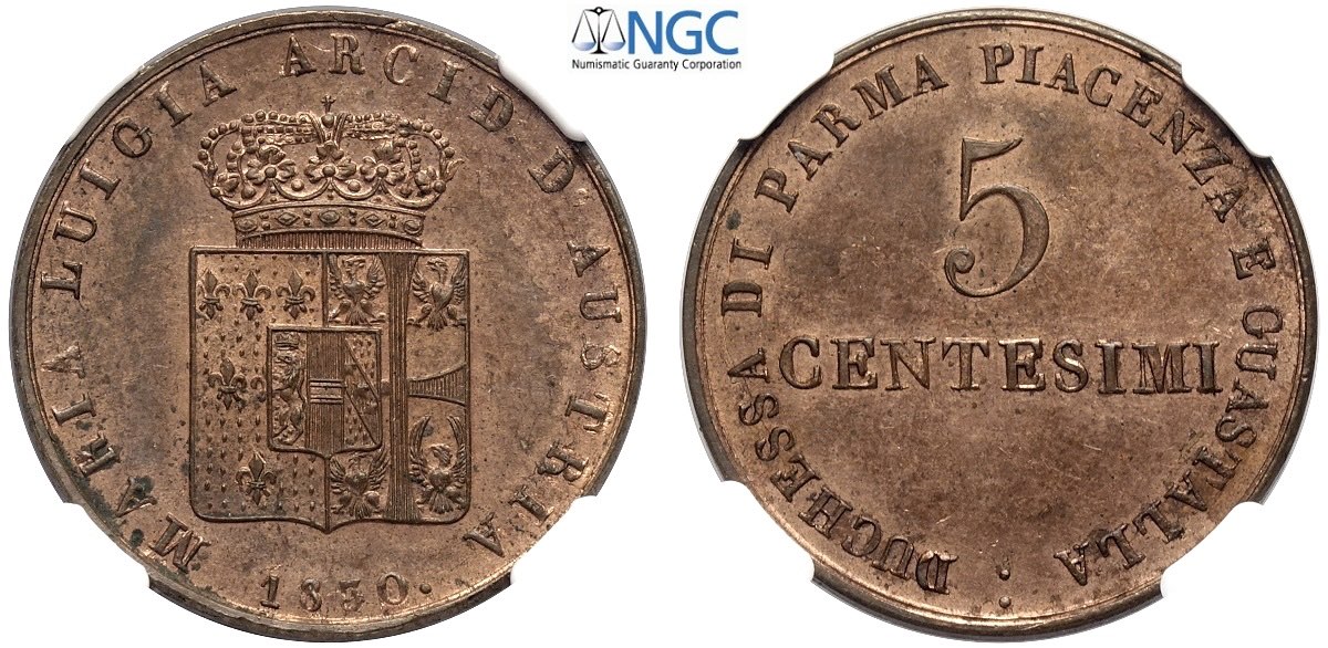 Parma, Maria Luigia d'Austria (1815-1847), 5 Centesimi 1830, Cu mm 27,2 in Slab NGC MS63 RB (second best grade)