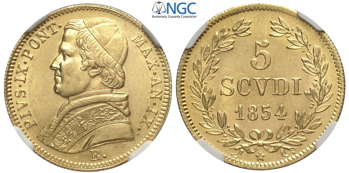 Roma, Pio IX (1846-1870), 5 Scudi 1854, Au mm 23 alta conservazione, in Slab NGC MS64 (second best grade)