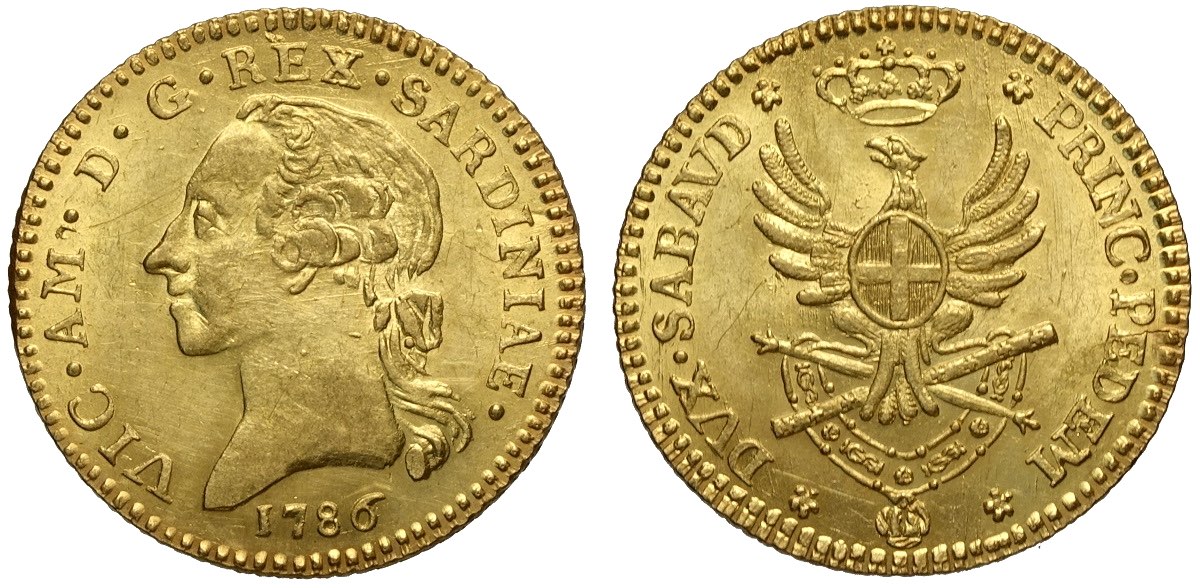 Savoia, Vittorio Amedeo III (1773-1796), Doppia 1786, Rara Au mm 26 g 9,14 di alta conservazione e bella freschezza, SPL-FDC