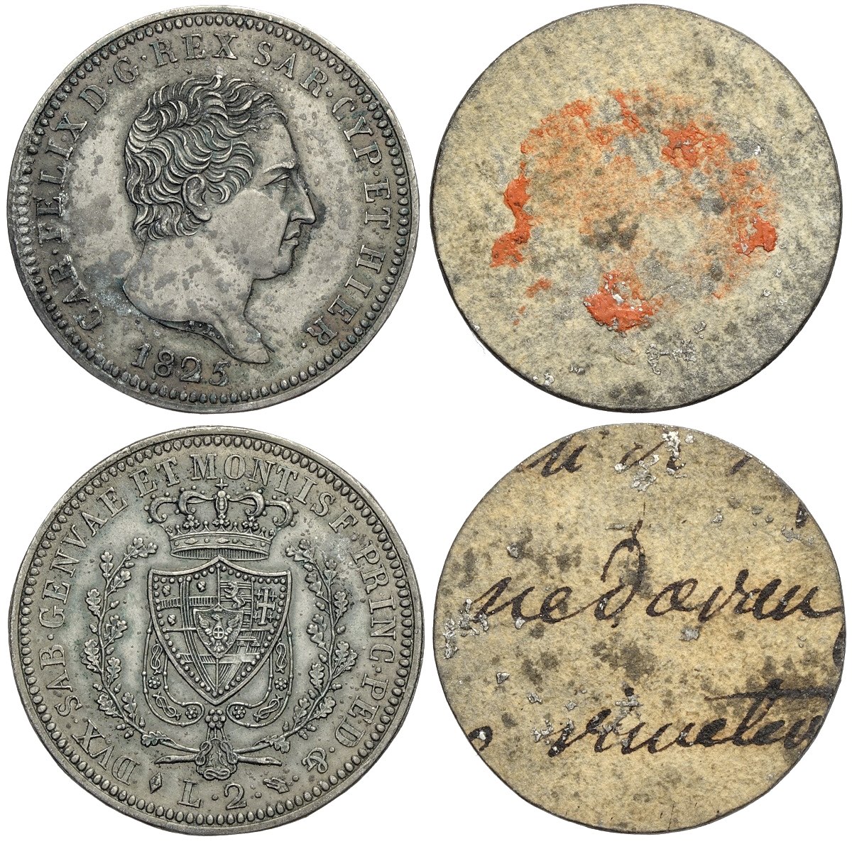 Savoia, Carlo Felice (1821-1831), 2 Lire 1825 composta da 2 lamine, RRRR Pag-9 Pb mm 27 g 2,74 e 2,73 per queste prove su lamina si utilizzava un metallo morbido per evitare danni al nuovo conio, venivano successivamente tenute in archivio come memoria delle coniazioni evitando così di immagazzinare e fare giacenze di metallo prezioso. FDC