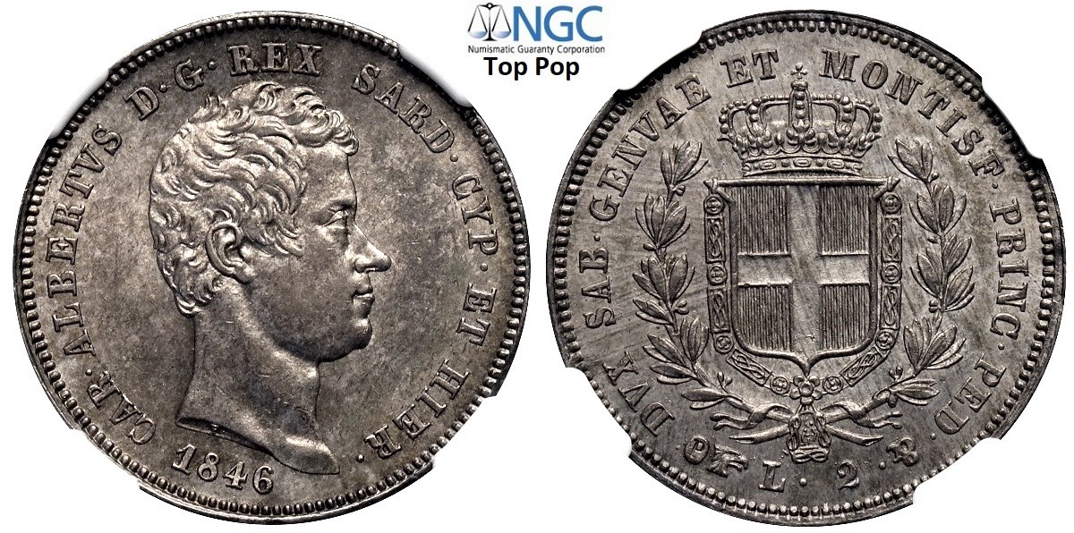 Savoia, Carlo Alberto (1831-1849), 2 Lire 1846 Torino, RR Ag mm 27 di eccelsa qualità, in Slab NGC MS64 (cert. 5784869004 Top Pop!)