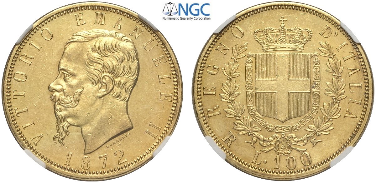 Regno d'Italia, Vittorio Emanuele II (1861-1878), 100 Lire 1872-R Roma, coniati 661 esemplari, RR Au mm 35 ottimo esemplare, in Slab NGC MS61