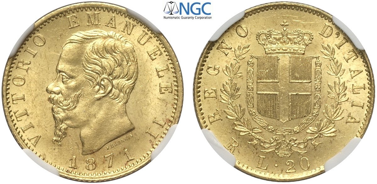 Regno d'Italia, Vittorio Emanuele II (1861-1878), 20 Lire 1871-R Roma, Rara Au mm 21 alta conservazione, in Slab NGC MS63