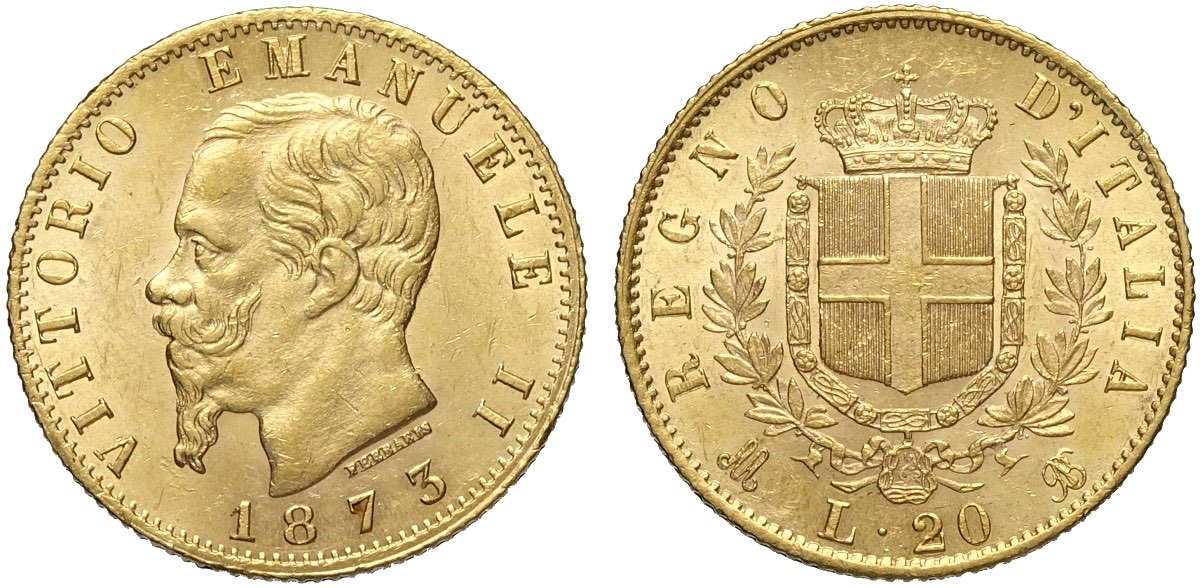 Regno d'Italia, Vittorio Emanuele II (1861-1878), 20 Lire 1873-M Milano, Au mm 21 di gran qualità, q.FDC
