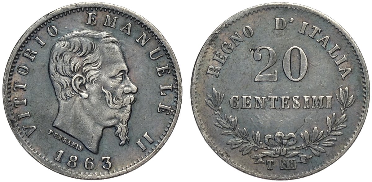 Regno d'Italia, Vittorio Emanuele II (1861-1878), 20 Centesimi 1863-T Torino BN Rovesciato, RRRR Ag mm 16 BB-SPL