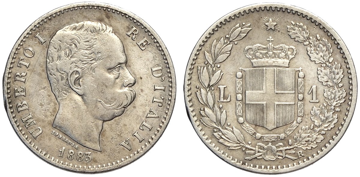 Regno d'Italia, Umberto I (1878-1900), Lira 1883, RRRR Au mm 23 di qualità già buona e superiore alla media per il millesimo, q.BB