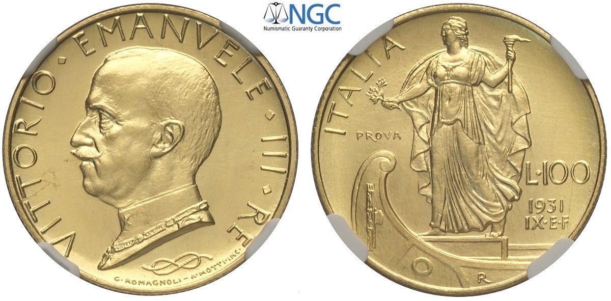 Regno d'Italia, Vittorio Emanuele III (1900-1943), 100 Lire 1931 Prova, Pag-160 RRRR Au mm 23,5 g 8,80 di eccezionale conservazione, in Slab NGC MS66 (second best grade)