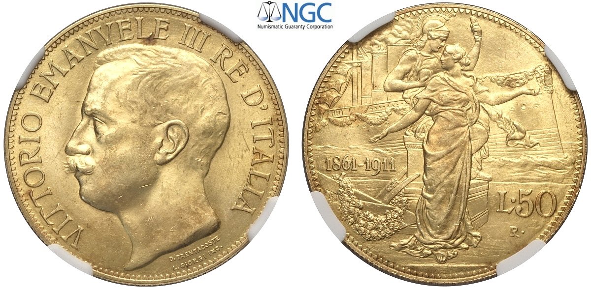 Regno d'Italia, Vittorio Emanuele III (1900-1943), 50 Lire 1911, Rara Au mm 28 alta conservazione, in Slab NGC MS63