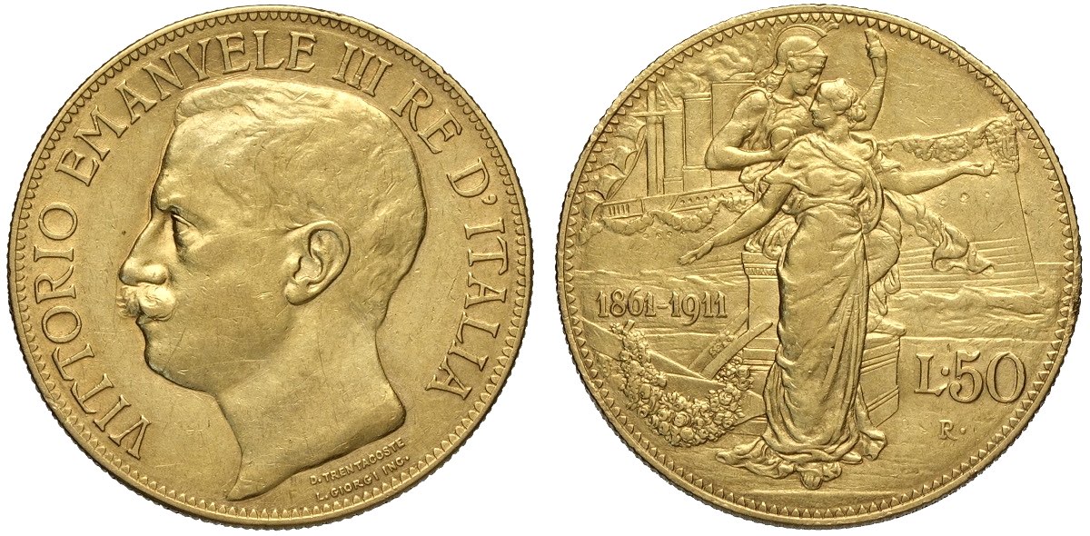 Regno d'Italia, Vittorio Emanuele III (1900-1943), 50 Lire 1911, Rara Au mm 28 g 16,09 colpetto, BB+