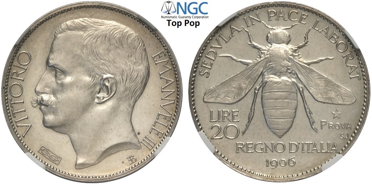 Regno d'Italia, Vittorio Emanuele III (1900-1943), 20 Lire 1906 Prova in Argento, Pag-177 Sim-38/c Mont-94 RRRRR Ag mm 21 g 4,17 di grande rarità e qualità (FDC) con fondi speculari, in Slab NGC MS63 (Cert. 6635676014 Unique Census and Top Pop!)