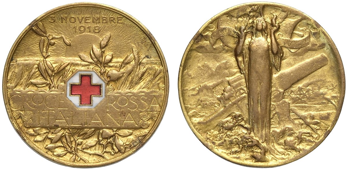 Regno d'Italia, Vittorio Emanuele III (1900-1943), 10 Centesimi 1918 Emesso a favore della Croce Rossa Italiana, Cu mm 30 g 9,24 versione in rame con doratura presumibilmente postuma, BB-SPL