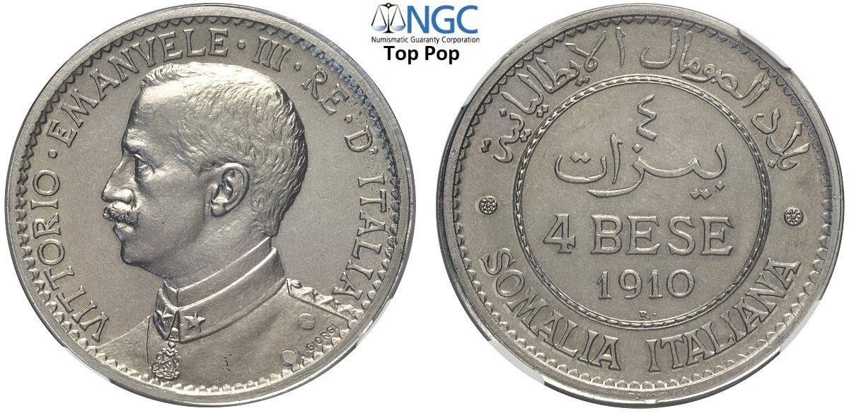 Regno d'Italia, Vittorio Emanuele III Colonia Somalia (1909-1925), 4 Bese 1910 Prova in Nickel, RRRRR Pag-399 Sim-324/1 KM-PR5, Ni mm 31 prova di grande rarità e certificata in versione proof, in slab NGC PF65 (cert. 6635663004 unique census and Top Pop!)