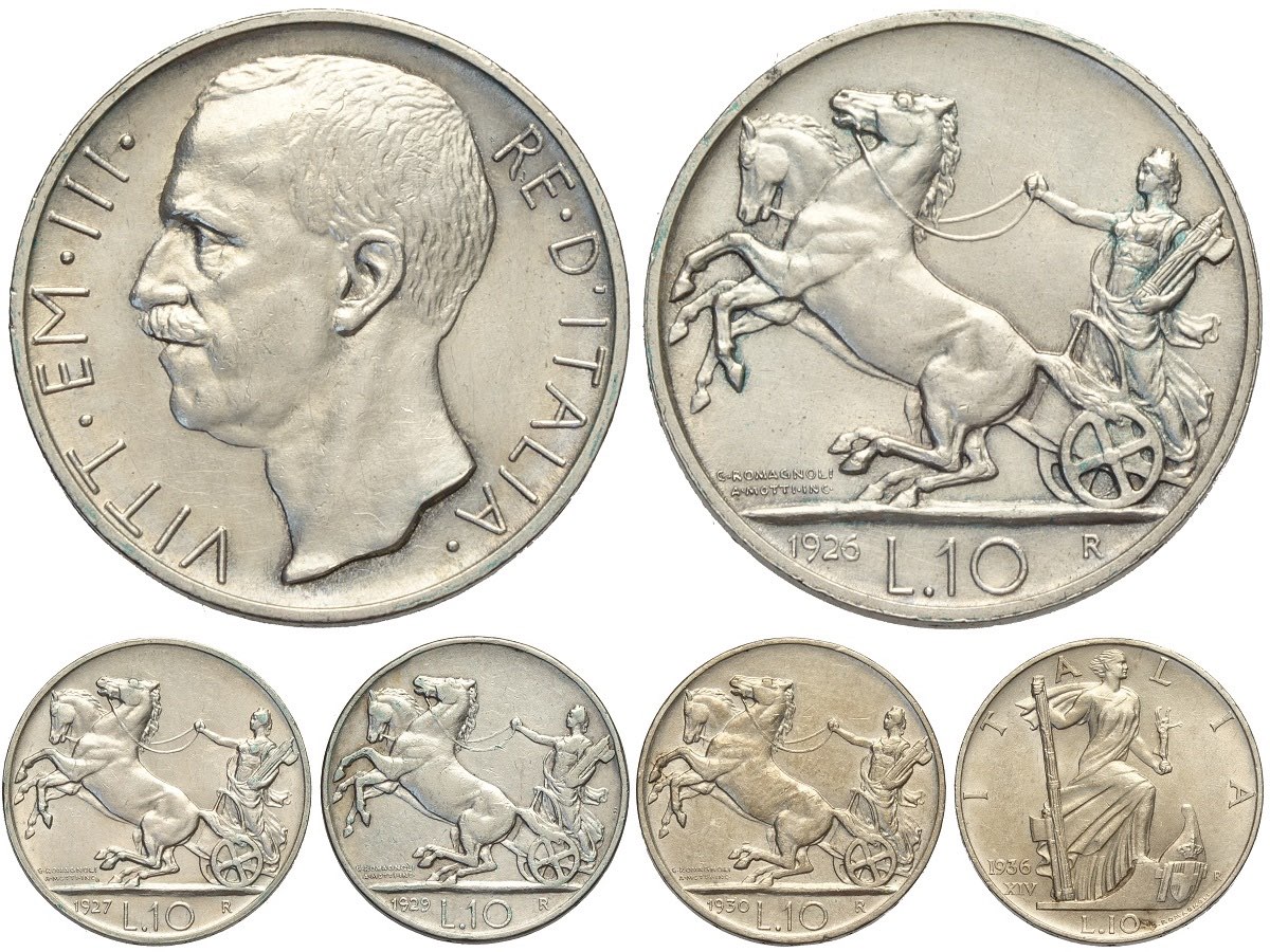 Regno d'Italia, Vittorio Emanuele III (1900-1943), Lotto di 5 Monete differenti da 10 Lire, si segnala: 1926 Bordo Largo (RR, q.SPL), 1930 ... Read more