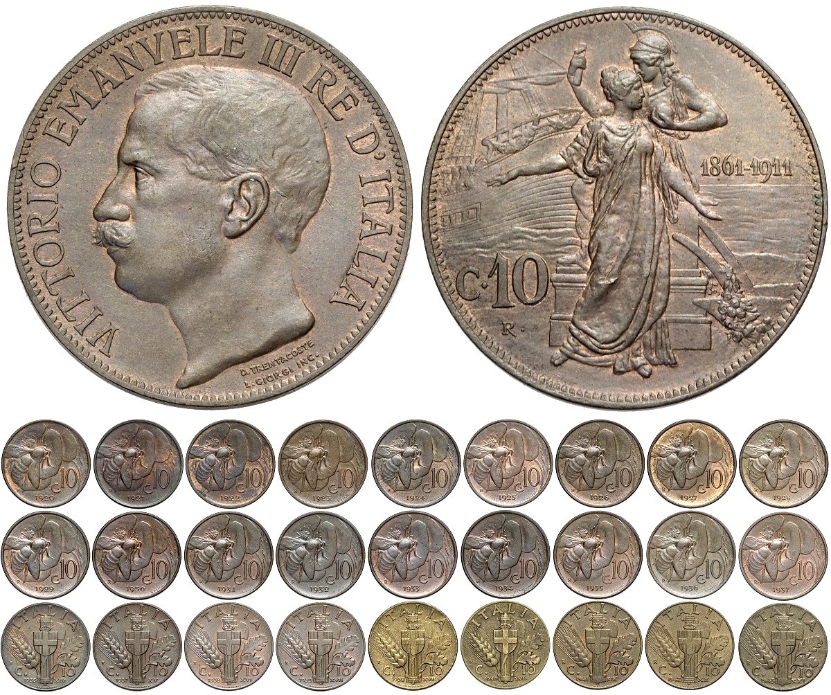 Regno d'Italia, Vittorio Emanuele III (1900-1943), Serie completa da 10 Centesimi (ad esclusione del 1919 venduto separatamente), totale 28 ... Read more