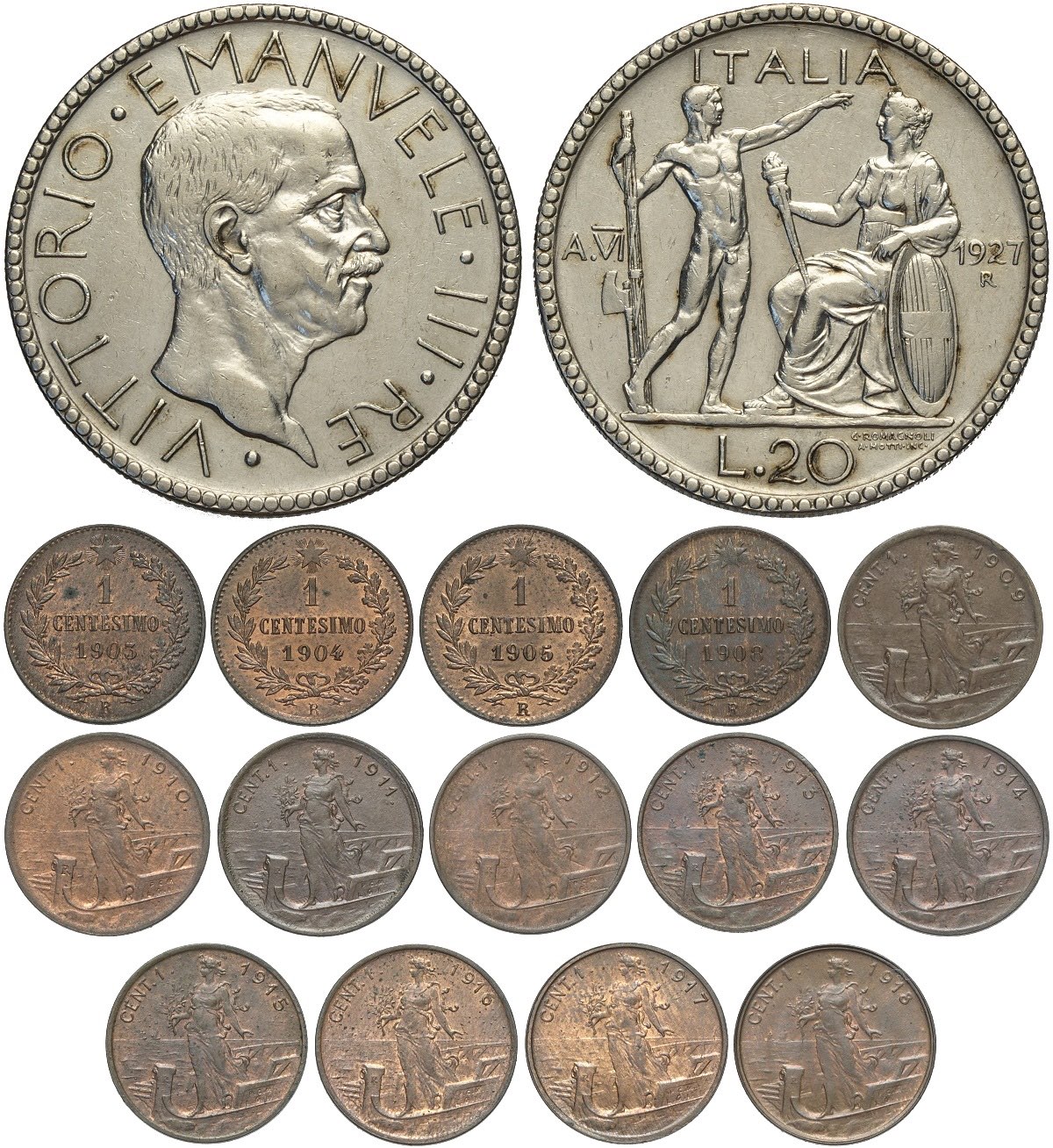 Regno d'Italia, Vittorio Emanuele III (1900-1943), Lotto di 15 Monete differenti: 20 Lire 1927-VI (BB), serie completa da un centesimo ad esclusione del 1902 e 1908 Prora (di ottima conservazione media, diversi esemplari in rame rosso)