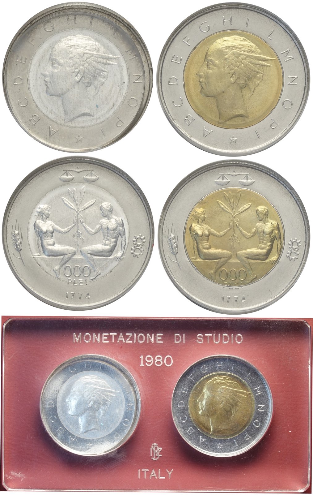 Repubblica Italiana, Monetazione in Lire (1946-2001), 500 Lire 1980 Progetto di due esemplari, uno bimetallico e uno apparentemente in ... Read more