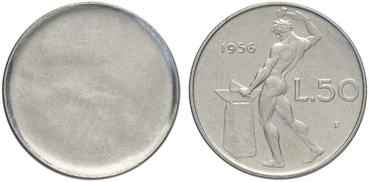 Repubblica Italiana, Monetazione in Lire (1946-2001), 50 Lire 1956 Uniface, coniata solo al rovescio, la rigatura del contorno risulta correttamente coniata, Ac mm 24,8 g 6,25 SPL