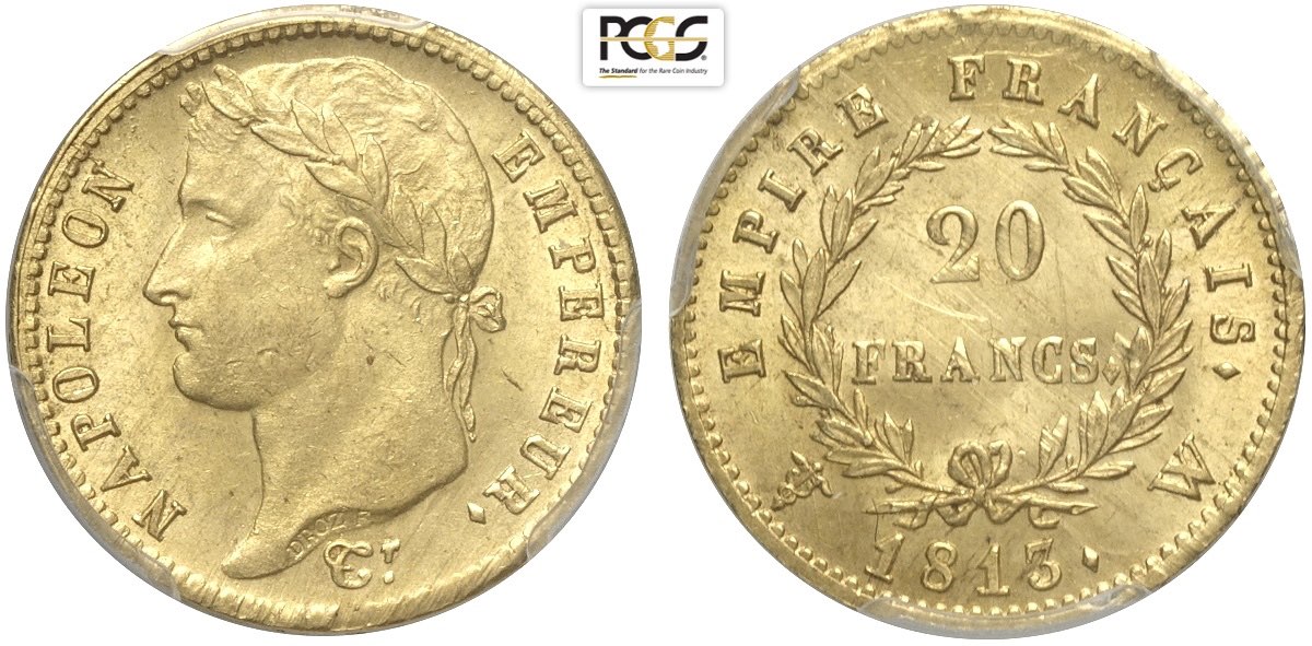 France, Napoleon I (1799-1814), 20 Francs 1813-W Lille, Au mm 21 di eccezionale qualità, in Slab PCGS MS64