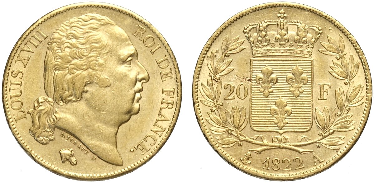 France, Louis XVIII (1814-1824), 20 Francs 1822-A Paris, Au mm 21 SPL+