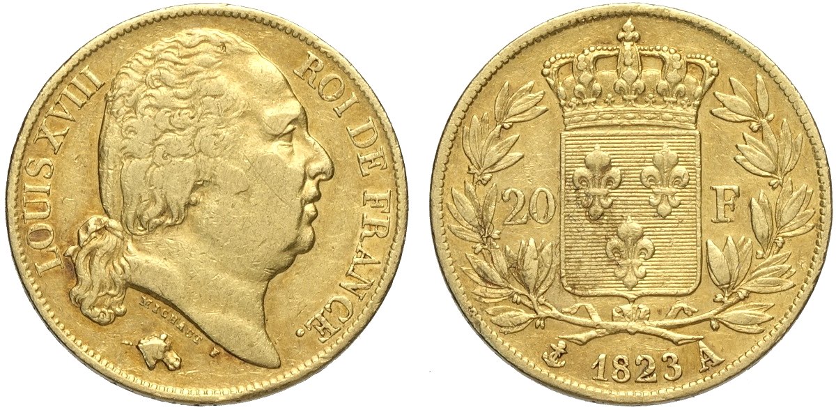 Lot 435 - France, Louis XVIII (1814-1824), 20 Francs 1823-A Paris, Au ...