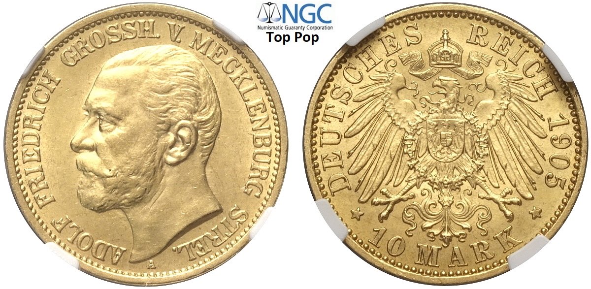 Germany Mecklenburg-Strelitz, Adolf Friedrich V (1904-1914), 10 Mark 1905, Mintage: 1000, Au mm 19,5 conservazione eccezionale per il tipo, in Slab NGC MS64 (cert. 6638007009 Top Pop!)