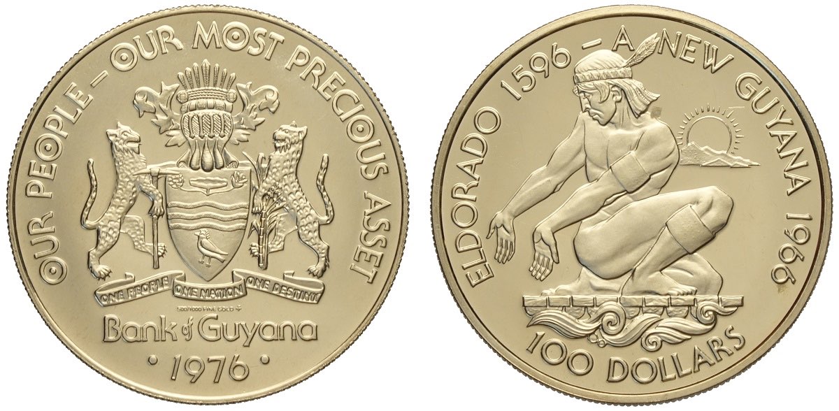 Guyana, Republic, 100 Dollars 1976, Au 500/1000 mm 25 g 5,74 Proof
