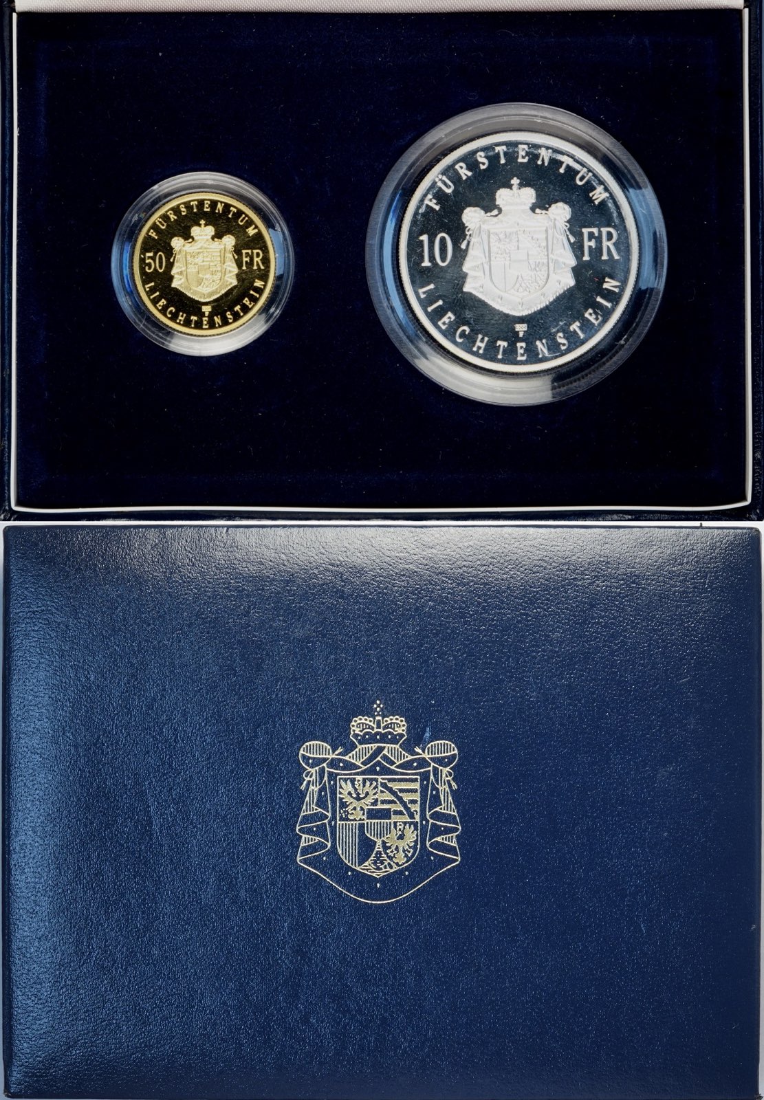 Liechtenstein, Hans Adam II (1990-), Gold and Silver Proof Set 1990 (2) 50 and 10 Francs, Au g 10,00 Ag g 30,00, original box