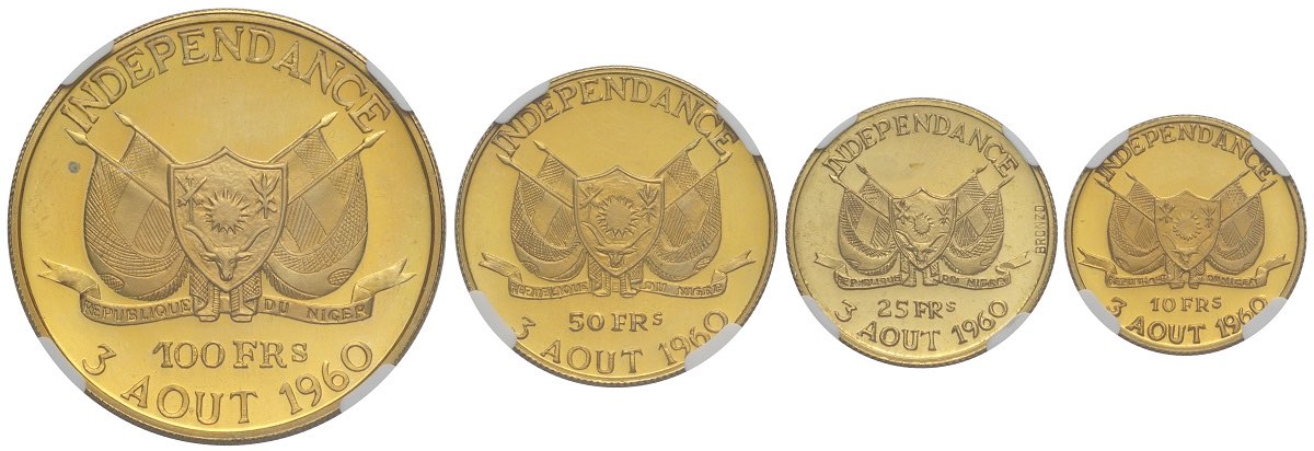 Niger, Republic, Gilt Bronze Pattern Proof Set 1960 (4), Km-unlisted, Cu mm 20-36, in Slab NGC: 100 Francs PF67 Ultra Cameo (Top Pop!); 50 Francs PF64 Cameo (Top Pop!); 25 Francs PF64 Cameo (Top Pop!); 10 Francs PF64 Ultra Cameo (Top Pop!) accompanied by the envelopes of the Mint with the archive number. Extraordinary set