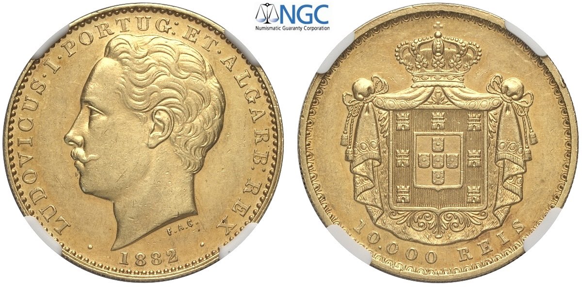Portugal, Luiz I (1861-1889), 10000 Reis 1882, Au mm 28 in Slab NGC AU58