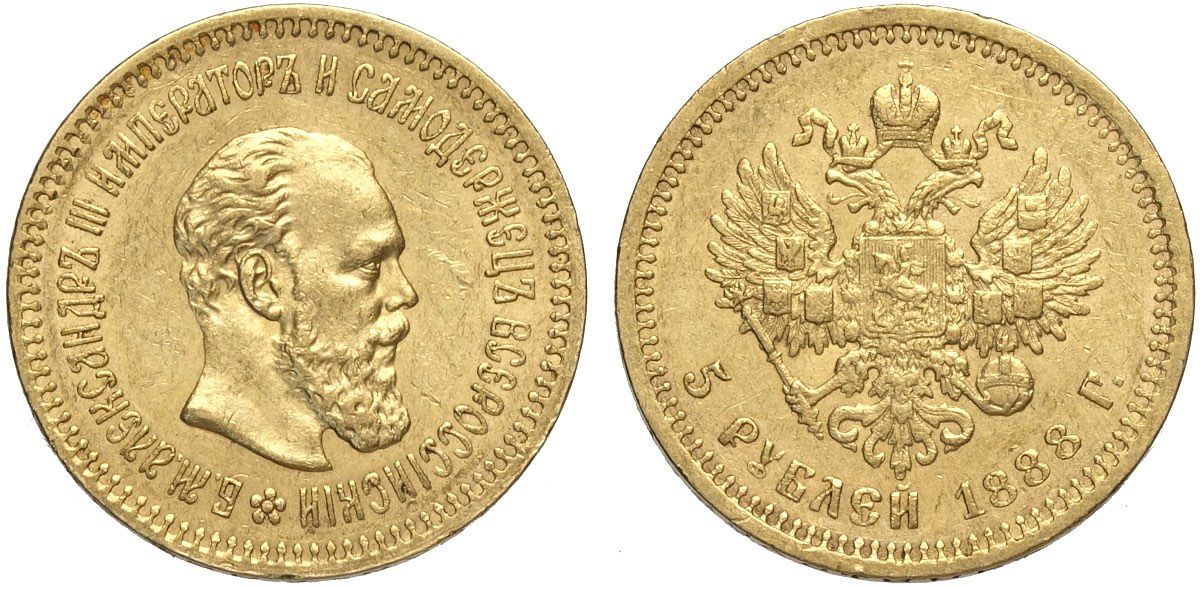 Lot 564 - Russia, Alexander III (1881-1894), 5 Roubles 1888, Au mm ...