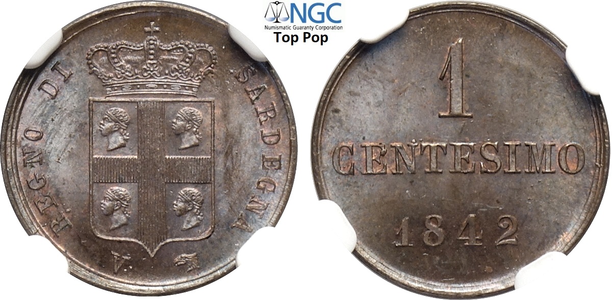 Savoia, Carlo Alberto (1831-1849), Centesimo 1842, RR Cu 15 mm , conservazione eccezionale per questa tipologia, in Slab NGC MS64 BN Top Pop! (cert. 6641298003)