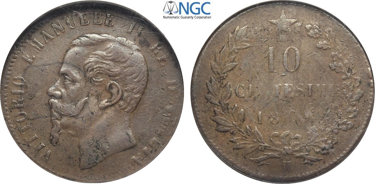 Regno d'Italia, Vittorio Emanuele II (1861-1878), 10 Centesimi 1866-H ribattuto su Penny 1860. Cu 30 mm , il Gigante cita in merito a questa moneta: si conoscono due soli esemplari di questa moneta, entrambi in collezioni USA, in cui s'intravede il conio della monete da One Penny 1860. La coniazione di entrambe le monete fu commissionata alla Ralph Heaton & Sons che tentò di riutilizzare senza successo i tondelli precedentemente coniati da One Penny. In slab NGC Mint Error VG10 (cert. 1521584009)