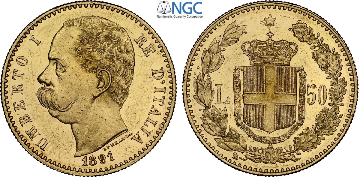 Regno d'Italia, Umberto I (1878-1900), 50 Lire 1891, Tiratura: 414, RRR Au 28 mm , fondi speculari, in Slab NGC MS61+ PL