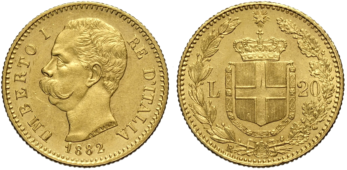 Regno d'Italia, Umberto I (1878-1900), 20 Lire 1882, Au 21 mm , ex asta Inasta-100 lotto-473 classificata "q.FDC-FDC"