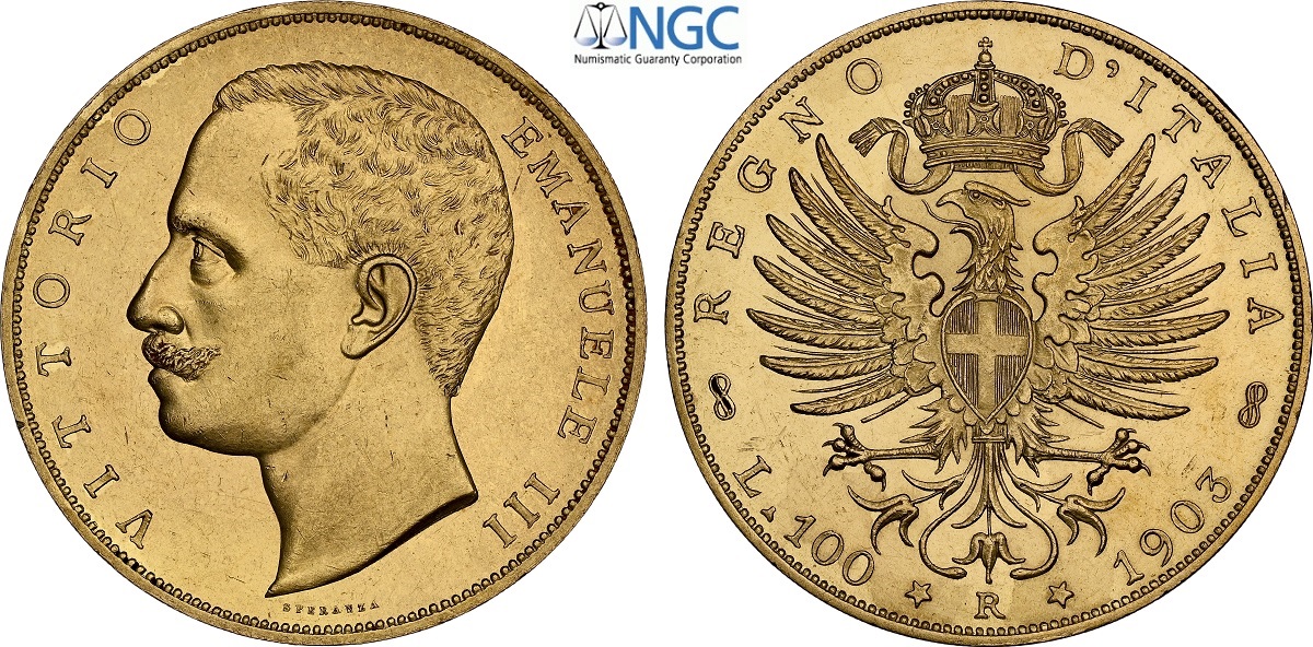 Regno d'Italia, Vittorio Emanuele III (1900-1943), 100 Lire 1903, RR coniati 996 esemplari, Au 35 mm , in Slab NGC UNC-rev cleaned ... Read more