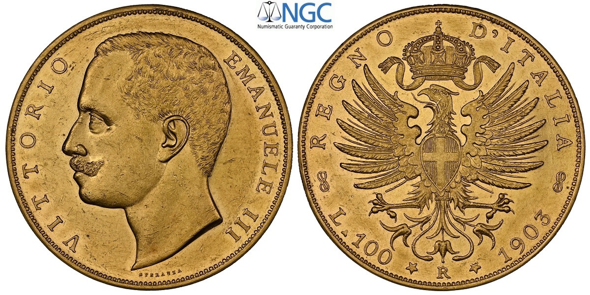 Regno d'Italia, Vittorio Emanuele III (1900-1943), 100 Lire 1903, RR coniati 996 esemplari, Au 35 mm , in Slab NGC UNC-rim filing (lievi ... Read more
