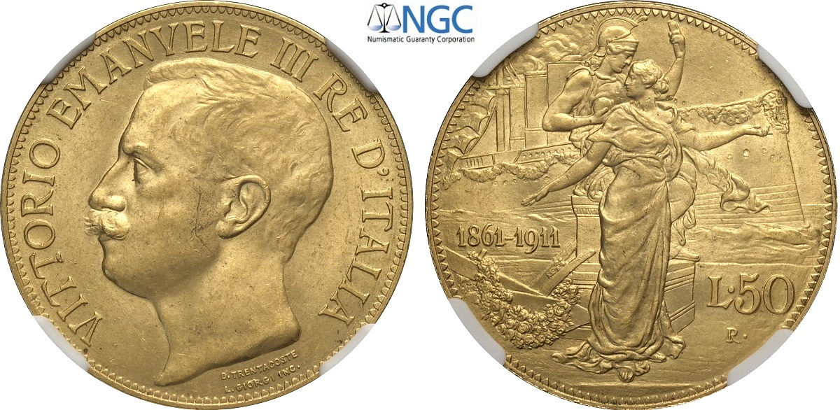 Regno d'Italia, Vittorio Emanuele III (1900-1943), 50 Lire 1911, Rara Au 28 mm , in Slab NGC MS63