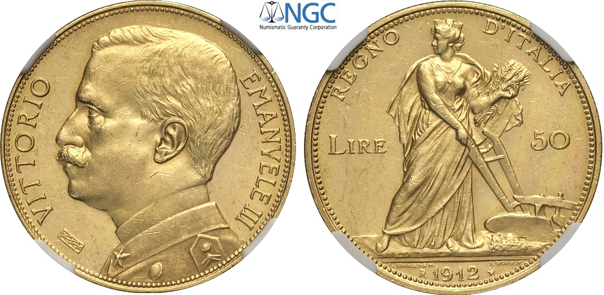 Regno d'Italia, Vittorio Emanuele III (1900-1943), 50 Lire 1912, Rara Au 28 mm , in Slab NGC MS61