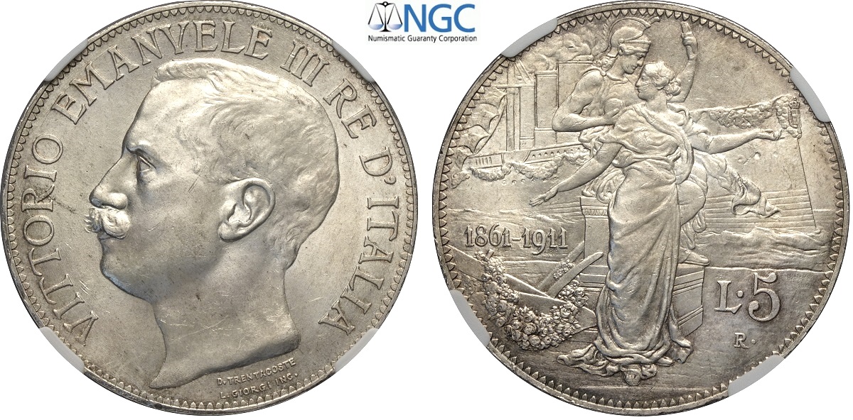 Regno d'Italia, Vittorio Emanuele III (1900-1943), 5 Lire 1911, Rara Ag 37 mm , di eccezionale qualità, in Slab NGC MS65 (cert. 6636881004 second best grade)