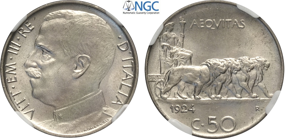 Regno d'Italia, Vittorio Emanuele III (1900-1943), 50 Centesimi 1924 C/ liscio, RRR Ni 23,8 mm , in Slab NGC MS64