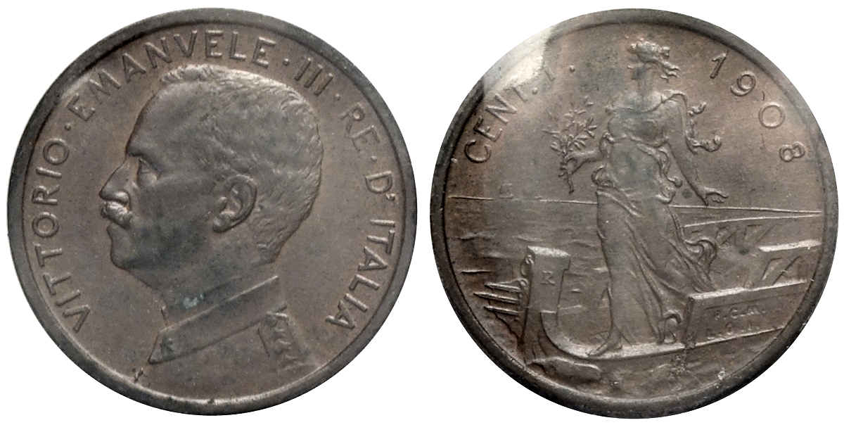Regno d'Italia, Vittorio Emanuele III (1900-1943), Centesimo 1908 Italia su Prora, RR Cu mm 15 , periziata SPL-FDC da E. Tevere