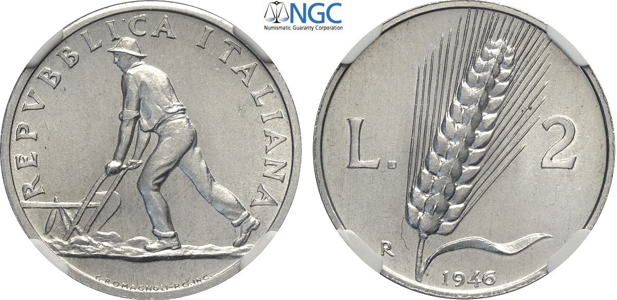 Repubblica Italiana, Monetazione in Lire (1946-2001), 2 Lire 1946, Rara It 24,1 mm , in Slab NGC MS65
