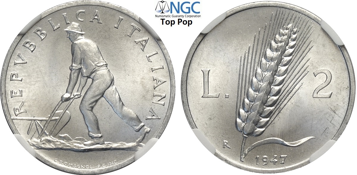Repubblica Italiana, Monetazione in Lire (1946-2001), 2 Lire 1947, RRR It 24,1 mm , eccezionale, in Slab NGC MS66 Top Pop! (cert. 6635679016)