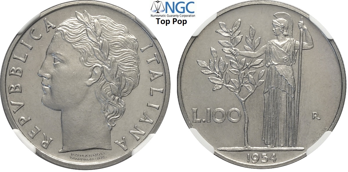 Repubblica Italiana, Monetazione in Lire (1946-2001), 100 Lire 1954 Prova, RRR Pag-693 Ac 27,8 mm , in Slab NGC MS66 Top Pop! (cert. 6635654014)