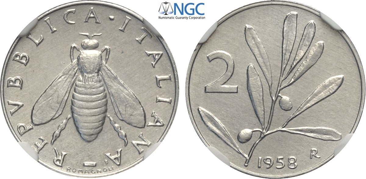 Repubblica Italiana, Monetazione in Lire (1946-2001), 2 Lire 1958, RR It 18,3 mm , in Slab NGC UNC-Cleaned (impercettibile pulitura)