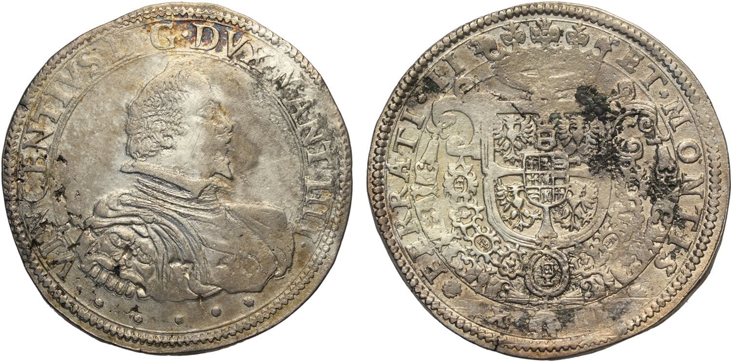 Casale, Vincenzo I Gonzaga (1587-1612), Ducatone da 12 Bianchi, RR CNI-53/55 Ag 42 mm 24,74 g, di buoni rilievi (BB+) ma porosità e sedimenti