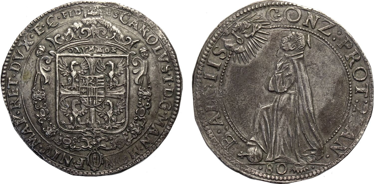 Mantova, Carlo I Gonzaga/Nevers (1627-1637), Mezzo Ducatone, Rara MIR-647/1 Ag 38,5 mm 14,52 g, bella patina q.SPL