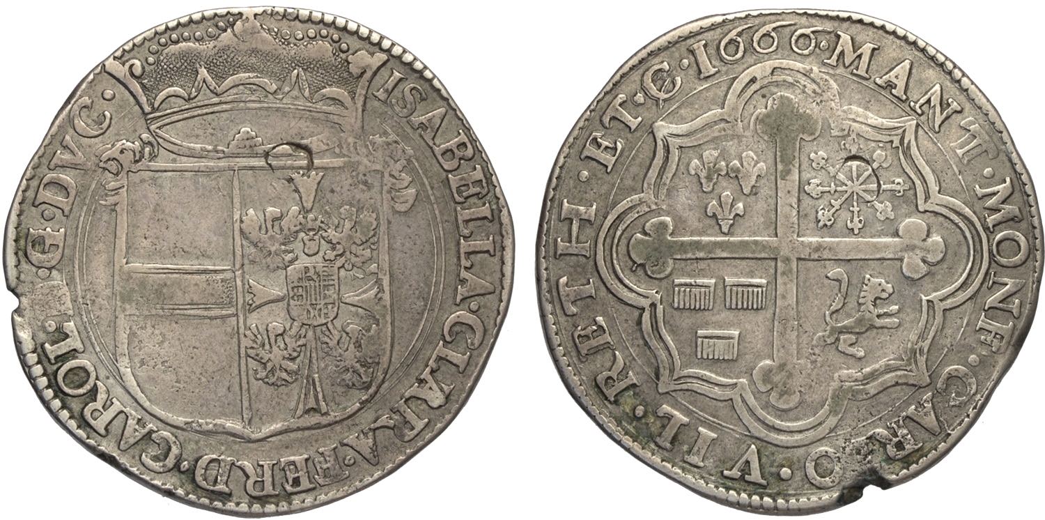 Mantova, Ferdinando Carlo Gonzaga/Nevers, reggenza della madre Isabella Clara (1665-1669), Scudo 1666, RR MIR-720 Ag 40 mm 22,10 g, BB+